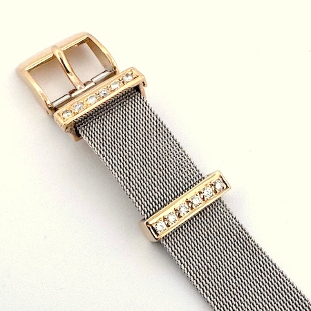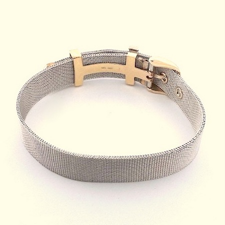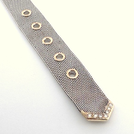 THE INTRICATELY WOVEN MESH BRACELET WITH 14K YELLOW GOLD ACCENTS CREATING A BELT BUCKLE MOTIF. THE TWO STAYS ARE SET WITH NINETEEN DIAMONDS THAT WEIGH APPROXIMATELY 0.30 CARAT TOTAL. THE BRACELET WITH AN INTERNAL  MECHANISM, MEASURING 9 INCHES, AND IS ADJUSTABLE.