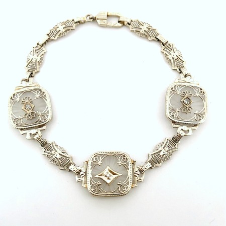 14K ART DECO CAMPHOR GLASS AND DIAMOND BRACELET.                                                                                             THE BRACELET WITH THREE CARVED CUSHION CUT ROCK QUARTZ DISKS; THE SIDE TWO SET WITH SMALL EUROPEAN CUT DIAMONDS THAT WEIGH 0.08 CARAT TOTAL. EACH DISK SEPARATED WITH A FILIGREE LINK AND FINISHED WITH TWO FILIGREE LINKS ON EACH SIDE. THE BRACELET MEASURES 7 1/4 INCHES LONG AND IS FINISHED WITH THE ORIGINAL CLASP.                                                                                      C. 1920’S