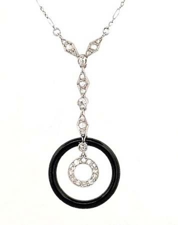 THE NECKLACE WITH ONE OPEN BLACK ONYX CIRCLE, SUSPENDED FROM AN INTRICATE CHAIN AND SUSPENDING AN OPEN CIRCLE OF ROSE CUT DIAMONDS THAT WEIGH APPROXIMATELY 0.50 CARAT TOTAL FOR THE PIECE. THE PENDANT IS DEDICATED TO AN 18″ DECORATIVE PLATINUM CHAIN; THE DROP MEASURES APPROXIMATELY 1.5 INCHES.