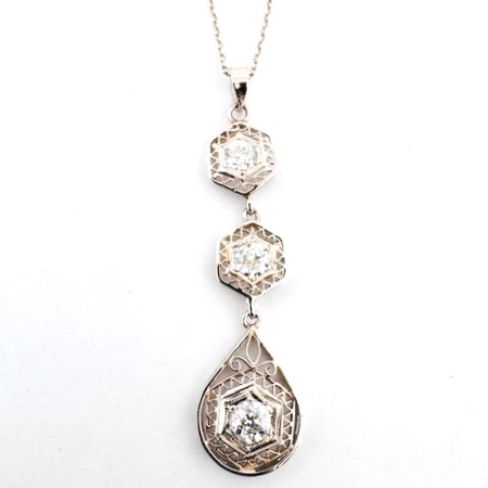 THREE SECTIONS OF GRADUATED FILIGREE DROPS; THE TOP TWO SET IN HEXAGON SHAPED FILIGREE SECTIONS AND THE BOTTOM A PEAR SHAPE, EACH SET WITH ONE OLD MINE DIAMOND THAT WEIGH APPROXIMATELY 1.00 CARAT TOTAL. THE NECKLACE INCLUDING BALE MEASURES 1 3/4 INCHESĀ AND IS SUSPENDED ON A 16 INCH CHAIN.