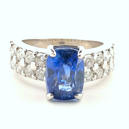 ONE CENTER CUSHION CUT CEYLON CORNFLOWER BLUE SAPPHIRE THAT WEIGHS 5.06 CARATS, WITH GEM REPORT AAP1650. THE SETTING WITH TWENTY ROUND DIAMONDS THAT WEIGH 1.00 CARAT TOTAL.