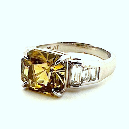 ONE CENTER SQUARE CUT CHRYSOBERYL THAT WEIGHS 5.12 CARATS. THE SETTING IS EMBELLISHED WITH SIX GRADUATED BAGUETTE DIAMONDS THAT WEIGH 0.66 CARAT TOTAL WEIGHT.