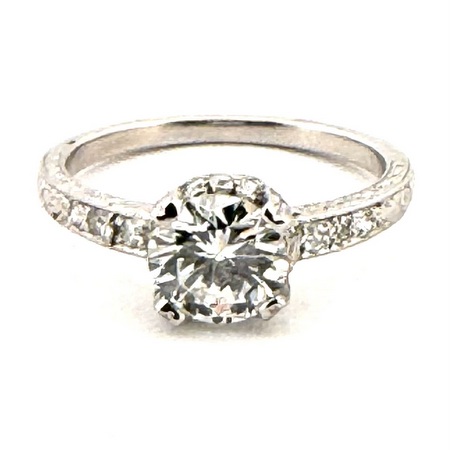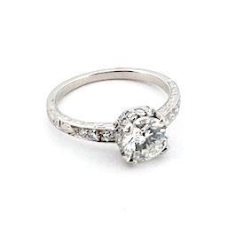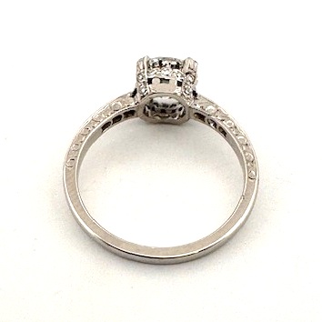 ONE ROUND EUROPEAN CUT DIAMOND THAT WEIGHS 0.81 CARAT, SET IN A FOUR PRONG HEAD WITH AN UNDERSIDE HALO OF SMALL DIAMONDS, EMBELLISHED WITH SMALL DIAMONDS AND MILGRAIN EDGE ON THE SHANK.